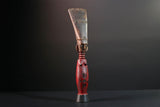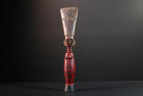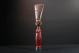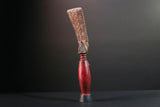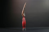 The figure presents a red-painted torso with geometric scarification near the navel and chest. Her head is topped with a tall natural-finish crest carved with etched triangle motifs. The elongated form rests on a flared black base. The face features white dot eyes and a poised expression.