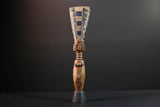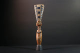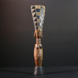 The figure is carved from warm-toned wood, with a textured black base. The flared hair crest is adorned with a checkered pattern of alternating dark and natural wood tones. Her body is elongated, featuring a high neck, stylized breasts, and engraved markings at the belly and back. A calm facial expression and incised eyes reinforce her ceremonial nature.