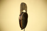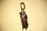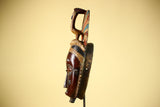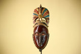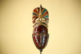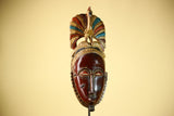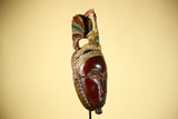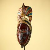 This elegant mask embodies the graceful sculptural style of the Guro people of Côte d’Ivoire. Rising above the mask, a carved bird stands on a colorful fan-shaped crest, adding height, balance, and symbolic meaning. The smooth, polished red face features narrow eyes, delicate markings, and refined contours that enrich the personality of the mask. Stand Not Included