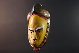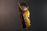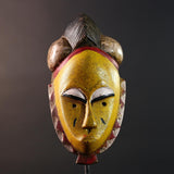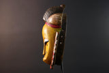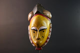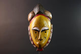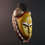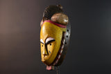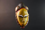 African mask Baule tribe yellow face carved wood with almond eyes rounded side buns geometric cheeks and central crest wall decor-G5539
