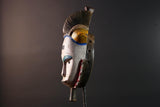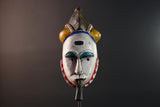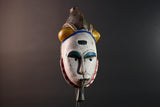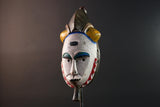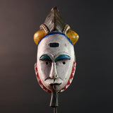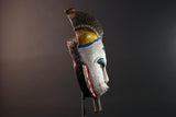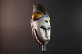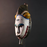 African mask Baule white face with horn crest red triangle trim green blue paint tribal wall decor spiritual carving wood sculpture-G5549