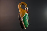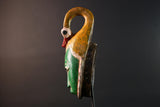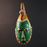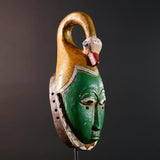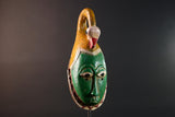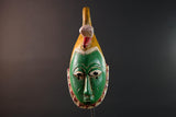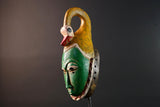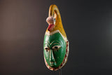 African mask Guro carving with bird crest green tribal face handmade spiritual decor red zigzag wall art wood sculpture tribal design-G5551