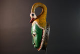 This African mask is a bold Guro carving with a vibrant green face and a sculpted bird crest, made for ceremonial and decorative use.