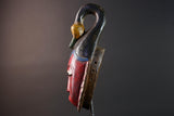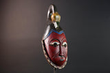 This African mask from the Guro tribe features a vibrant red face, arched brows, white almond eyes, and a sculpted bird crest — a symbolic fusion of beauty and spirit.