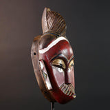 This African mask features a red face, almond eyes, and a carved central crest. As a Guro ceremonial piece, it brings symbolic energy and sculptural beauty to your space.
