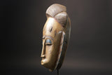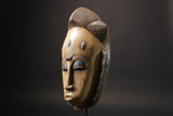 Guro African face mask represents the spirit of Gu mask African face mask , the wife of Zamble a supernatural being. Gu is often depicted as elegant, graceful, serene and beautiful. Important characteristics of note, found in African face mask are; A skillful combination of human and animal forms. Notable features on African face mask , are almond shaped eyes, rounded foreheads, finely African face mask nose and mouth with small but sprouting lips.