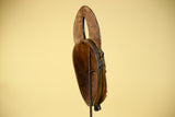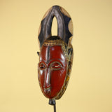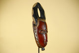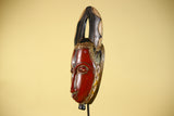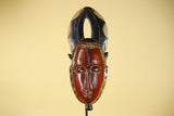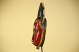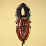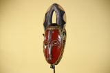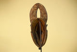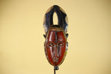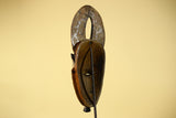 This hand-carved African mask features an elongated face and sculpted headdress, showcasing traditional craftsmanship and symbolic form. The smooth facial planes, warm patina, and carved detailing give the piece a refined and expressive presence.
