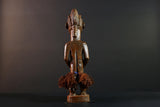 This hand-carved Baule figure represents a female ancestor spirit from Côte d’Ivoire. Crafted in traditional style, the sculpture features a tall, elegant posture, finely detailed facial markings, and a dark brown patina that reflects its tribal origin.