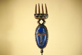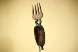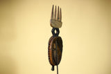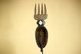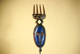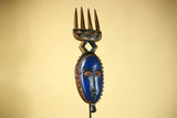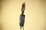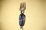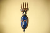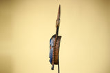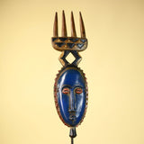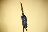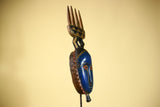This distinctive mask showcases the elegance and symbolic forms of Guro carving from Côte d’Ivoire. The mask features an elongated blue face framed by serrated geometric patterns, giving the mask both texture and presence. Above the mask, a carved crest shaped like a four-pronged comb rises from a diamond-shaped connector, providing balance and height to the sculpture. Stand Not Included