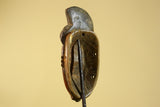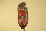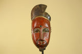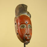 This African mask is a finely carved wooden African art piece attributed to the Baule style of Côte d’Ivoire. The mask presents a calm, dignified expression with elongated facial features, almond-shaped eyes, and a sculpted hairstyle typical of Baule portrait masks used in traditional performances and social ceremonies.
