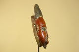 The surface displays a rich red and brown patina, with visible hand-carved tool marks and age-related wear that enhance its authenticity and character. This African mask wall art was hand-carved from a single piece of wood and retains its original surface finish.