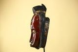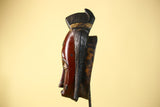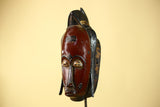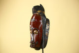 Made from solid wood, the African mask shows a rich aged patina with red and dark brown tones, reflecting its vintage character. These features make it a strong example of African masks used in ceremonial contexts and now appreciated as collectible African art.