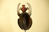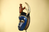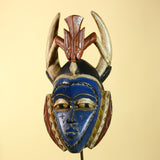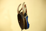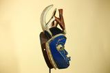 This handmade African mask is a powerful piece of wooden African art crafted in a traditional tribal style. Featuring a deep blue face, carved horn elements, and geometric side panels, this African mask reflects ceremonial African design used for ritual and cultural expression.