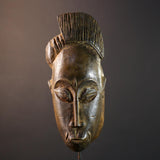 Hand-carved from hardwood and finished with a warm natural patina, the mask features delicate scarification near the mouth and temples, a refined nose, and closed almond-shaped eyes symbolizing peace. The tall crest hairstyle reflects Baule ideals of beauty and identity.