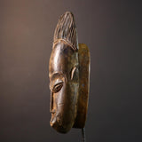This wooden mask is a traditional Baule Mblo mask, created as part of ceremonial performances that honored respected community members. Used in dance festivals, these portrait masks celebrate both ancestral spirits and the virtues of admired individuals — grace, wisdom, and inner calm.