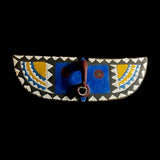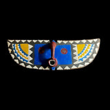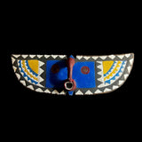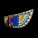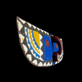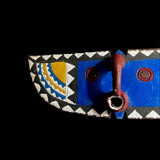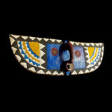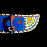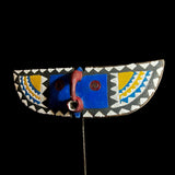 The An African Wall Decor Plank Mask, painted by the Bwa people from central Burkina Faso and Mali. They are a Gur people, speaking Gur languages. While the Bobo people, also from Burkina Faso, speak the Bobo language, a Mande language. Both these masks are are Bwa Hawk or Owl masks, we believe. The way to tell the difference between a Butterfly and an Owl mask is the Butterfly has a continuation of round circles on the wings and the Owl does not. The Southern Bwa are known for their tall plank masks and tend to use wood to make their masks