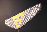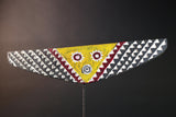 The butterfly mask is carved from wood and painted with red, white, black, and bright yellow — symbolic colors in Bwa cosmology. The sweeping “wings” are decorated with repeating triangular motifs. Three striking circular designs form the face of the mask, set in a bold yellow triangle.