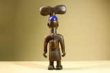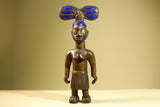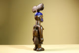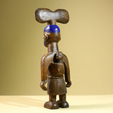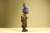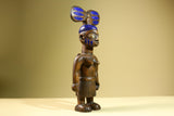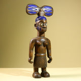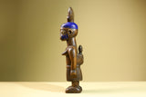 Statue – This African female statue is hand-carved from solid wood, depicting a mother carrying her child with a tall painted blue headdress and tribal markings. The carving highlights West African artistry with symbolic detail in the skirt and facial features. Measuring 41 cm high × 17.4 cm wide × 11 cm deep (16.1" × 6.8" × 4.3"), this tribal statue makes a striking addition to home decor or a unique collectible for African art lovers