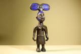 Statue – This African female statue is a hand-carved wood piece in a Yoruba tribal style, symbolizing fertility, family, and tradition. The figure features a mother carrying a child on her back, with bold carved details, geometric skirt patterns, and striking blue-painted accents on the headdress and face. Dimensions: 41.5 × 18.3 × 10.5 cm (16.3 × 7.2 × 4.1 inches). A cultural artwork for collectors or unique home décor