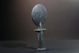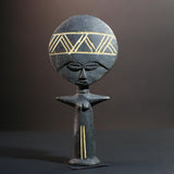Hand-carved from dark wood, the figure is defined by its stylized, disk-shaped head, serene almond-shaped eyes, and minimalist body form. Intricate geometric etchings crown the head, and subtle vertical detailing graces the base — reflecting both symbolic intention and artisanal mastery. The piece radiates calm, sacred energy and artistic strength.