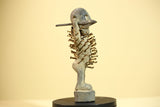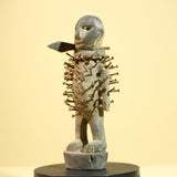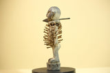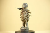 This African nail fetish statue, known as a Nkisi Nkondi, originates from the Kongo people of Congo. Hand-carved from wood and embedded with iron nails, the statue measures 22 cm × 10 cm × 6.5 cm (8.6 × 3.9 × 2.5 in). It served as a spiritual protector—each nail driven to invoke justice or healing. The figure’s strong posture and aged surface reveal powerful ritual symbolism. A captivating tribal art statue for collectors or décor. Stand not included.