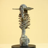 This vintage African tribal mask figurine is a unique display piece, showcasing intricate detailing and cultural significance. Carved from wood, it features nails inserted into the body, adding a bold artistic touch. This item measures 25.5 cm (10.04 in) in height, with a width of 8.5 cm (3.35 in) and a depth of 7.5 cm (2.95 in). Please note that the stand is not included. A perfect addition to your tribal art collection or as a one-of-a-kind statement piece in your home decor.