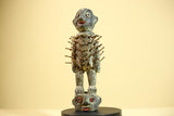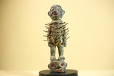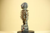 This African nail fetish statue from Congo is a striking ritual art figure, carved from solid wood and embedded with numerous iron nails. The statue stands on a smaller head figure, symbolizing ancestral power and spiritual protection. With its expressive face and authentic patina, this piece reflects deep cultural craftsmanship. It measures 23 cm (9.05 in) high, 11 cm (4.33 in) wide, and 8.1 cm (3.18 in) deep. A beautiful collectible for tribal art lovers. Stand not included.