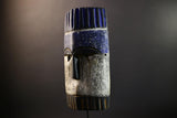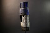 Indigo-blue ridged crown over a kaolin-patinated face and grooved base