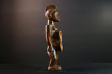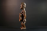 African tribal figure carved in wood from Congo, this powerful figure features a bold stance and a deeply hollowed torso, symbolizing ritual offering or spiritual absorption. With finely incised chest patterns and a square-shouldered form, the figure holds traditional female attributes and ceremonial stance. Common in Congo tribal art, such pieces were often used in protective or fertility rituals and are highly collectible. This authentic African sculpture is ideal for collectors of indigenous art or for creating a powerful focal point in your home decor.