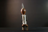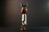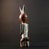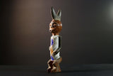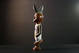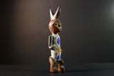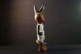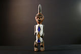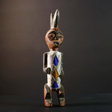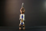 African tribal figure carved from wood with bold geometric painted details in blue, yellow, and white. This handmade statue measures 39 cm (15.3") high, 8.5 cm (3.3") wide, and 7.6 cm (3") deep, featuring a stylized face, scarification marks, and an upright crest. Perfect for home decor, cultural art displays, or as a collector’s piece. The figure’s expressive design adds character and history to any space