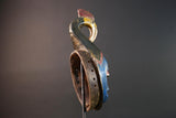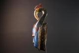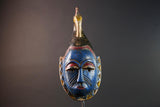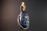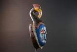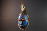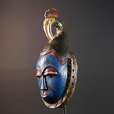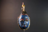 African tribal mask Guro carved wood wall decor with blue face bird crest scarification red white eyelids artisan symbolic sculpture-G5517