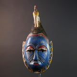Eye-catching Guro tribal mask with blue face, curved bird crest, and bold scarification—ideal for symbolic African wall display.