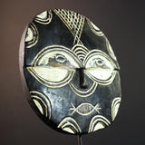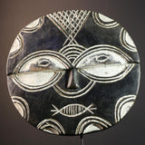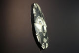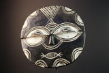 Carved from hardwood and painted in black and white natural pigments, the design features concentric ovals for the eyes, a fish-like diamond mouth, and symbolic forehead latticework. Curved rays ring the edges, suggesting spirit energy and ancestral radiance. This ceremonial mask is striking as both tribal wall decor and symbolic storytelling sculpture.