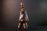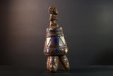African Tribal Vessel Hand Carved Ritual Jar with Female Figure Blue White Patterned Tripod Urn Nigerian Wood Art Decor-G5621