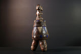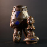 This African tribal vessel is a captivating ceremonial artifact adorned with blue and white geometric panels and a symbolic female figure seated on top. The container rests on a sculptural tripod base formed by three stylized heads, reflecting deep ancestral symbolism and traditional artistry.