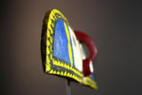 This wide mask features blue wings, yellow edge triangles, and a red central nose/beak. The interior of the mask shows a white geometric face, flanked by yellow glyphs. The bold lines and saturated pigments are hallmarks of Bwa symbolic design, carved from wood and painted with natural dyes.