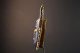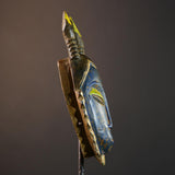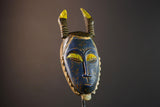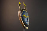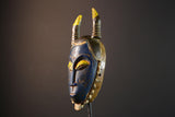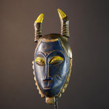 African wall mask with spiritual symbolism, carved by Baule artisans of Côte d’Ivoire and painted in blue with yellow-highlighted horns.