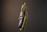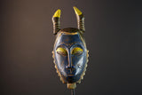 African wall mask, Baule horned face from Côte d’Ivoire, tribal blue sculpture, handmade wood carving, cultural home wall decor-G5393
