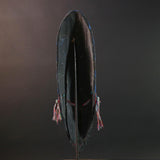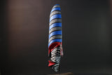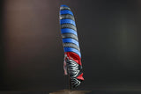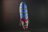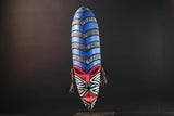This handcrafted african wall mask features a dynamic geometric design painted in vivid red, blue, black, and white. The elongated face and symmetrical lines give the piece a striking presence, perfect for gallery-style interiors. The side tassels enhance its tribal-inspired charm.