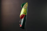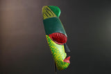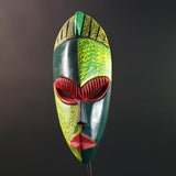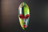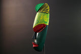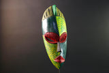 This african wall mask was hand-carved and painted for vibrant decorative display. Featuring a long symmetrical face, bright green and yellow patterning, and red lips and eyes, this african wall mask blends traditional styling with modern artistic design. Its smooth wood structure and sculpted features reflect the craftsmanship of African wall sculpture.