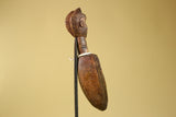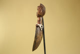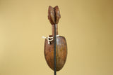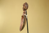 The piece is carved from a single block of wood and shows natural surface wear, aged patina, and traditional carving marks. The elongated form and calm facial expression reflect classic African figurative carving styles. This ceremonial spoon works beautifully as African wall art, a collector’s piece, or a display object in a tribal art collection.
