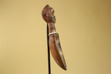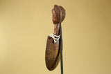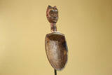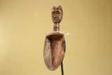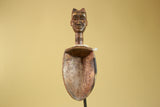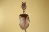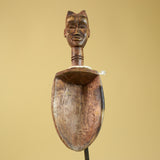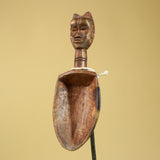 This African ceremonial spoon is a hand carved wooden ritual object featuring a sculpted human figure above a deep bowl. Ceremonial spoons were often symbolic items used in cultural traditions, hospitality rituals, or as status objects rather than everyday utensils.