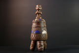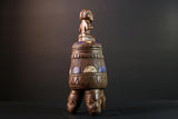 This powerful African tribal figure sculpture features a ceremonial Yoruba container adorned with a seated female form on its lid. Hand-carved by Yoruba artisans of Nigeria, this African tribal figure reflects spiritual guardianship and ancestral symbolism. The container body is richly textured with hand-chiseled lines and painted motifs in blue and natural earth tones, reinforcing its ceremonial role in Yoruba traditions. The African tribal figure on the lid represents femininity, fertility, and community wisdom—essential values in Yoruba cosmology.