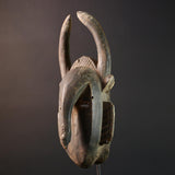 Carved from dark hardwood, this mask features a highly stylized face with vertical cheek lines, almond eyes, and a downward-curved central ridge that merges into a long nose. The mask’s two sweeping horns complete its powerful silhouette. Each detail speaks to Baule aesthetic balance—restraint, elegance, and spiritual symbolism.