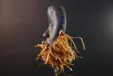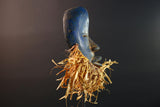 This striking African mask features a smooth blue-painted face African mask with slitted eyes and a carved open mouth, framed by a full raffia fiber fringe. Originating from the Dan people of Côte d’Ivoire, the mask symbolizes ancestral spirits and is used in ritual ceremonies.