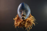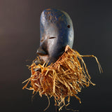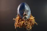 African mask Dan blue face with raffia fringe, slitted eyes, tribal carving from Côte d’Ivoire for ceremonial wall art or decor G5576