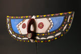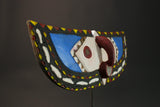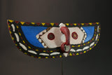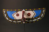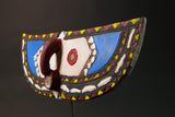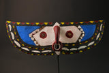 African Wall Decor Plank Mask, painted by the Bwa people from central Burkina Faso and Mali. They are a Gur people, speaking Gur languages. While the Bobo people, also from Burkina Faso, speak the Bobo language, a Mande language. Both these masks are are Bwa Hawk or Owl masks, we believe. The way to tell the difference between a Butterfly and an Owl mask is the Butterfly has a continuation of round circles on the wings and the Owl does not. The Southern Bwa are known for their tall plank masks and tend to use wood to make their masks.