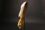 The primitive Lega mask's geometry is distinguished by its crisp contours and forms. Its design is marked by a unique and captivating aesthetic, in which three distinct nasal edges produce a dramatic contrast with the eyelids. Consequently, the mask bears a striking appearance.