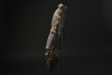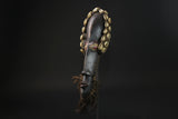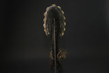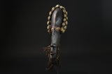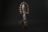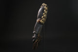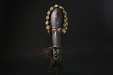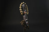 This African Mask from the Dan people of the Coast and Liberia is . It features cowrie shells, bells, fabric and raffia, stitched to a hand-painted wooden mask. Cowrie shells were once used as money by many African peoples, so their abundance on this mask is a symbol of wealth. A variation of côte d'Ivoire's Dangle African wood African face africa wood mask,, this sculpted face features a sunken look enhanced by a sculpted wolf coated in kaolin. The mouth is classically protruding