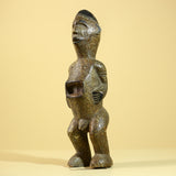 This vintage wooden statue is a hand-carved tribal figure with bold, expressive features and a powerful sculptural presence. The statue shows a stylized standing figure with carved facial markings, thick legs, and a hollowed chest panel, giving it a unique character typical of rustic ethnographic artwork. Aged surface patina highlights the handmade qualities of the statue, adding depth, texture, and visual interest.